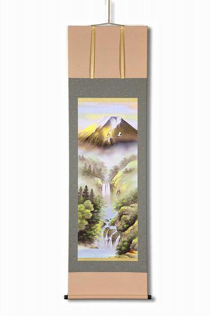 | 旭日の霊光を浴びて真紅に染まる金富士を背に、仲睦まじく優雅に飛翔する鶴の群れ。鮮やかな彩りが吉祥慶賀の極みをあらわす逸品です。古来より日本の象徴として信仰され崇められてきた霊峰富士。富士は出世・繁栄を招き、特に金富士には絶大な金運を高めるとされている、よりよい縁起物です。おめでたい金富士の肉筆の掛軸を桐箱に入れてお届けします。 |