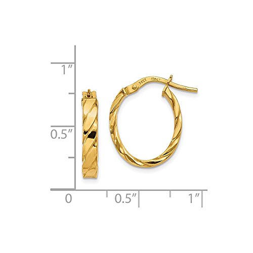 -. Title : 3 mm Patterned Oval Hoop Earrings in Genuine 14k Yellow Gold - 19 to 24mm