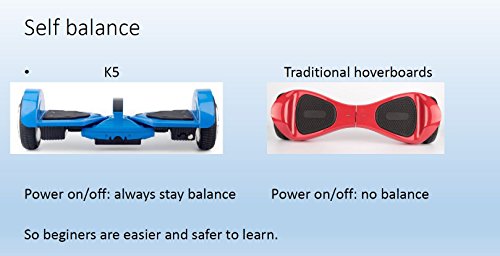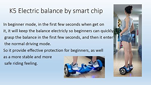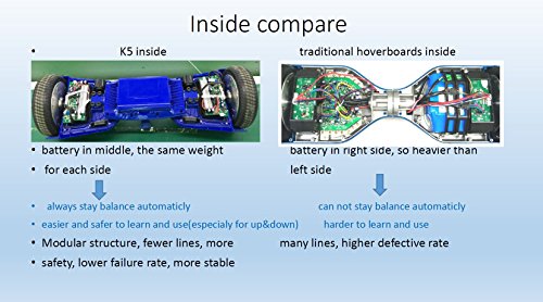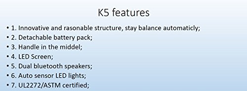 Description The next generation K5 brings exciting new features to self-balancing scooters! It has a new smart display, built-in Bluetooth speakers, built-in carrying handle as well as a smart LED headlight. To top it off, a stunning black paint finish. Guaranteed Safe - UL 2272, CE, RoHS, and FCC Certificates Approved. Fun & Loud - Dual built-in Bluetooth speakers means listening to music has never been more enjoyable. Quick to Charge - 36V Swappable Lithium Ion Battery; charges from empty in about 2 hours. Smart Technology - Auto headlight and featured smart display; displays battery%, speed, temperature and Bluetooth activity. User-Friendly - This hoverboard is designed for children 8 years and up; supports up to 220 pounds maximum weight. Specs.: 1. 50% weight each side to keep it auto balance before turn on and after turn off, and much more stable, easier and safe to ride, especially for beginners; 2. Modular structure, much less cables, more safe, much lower defective rate(3 per thousand) and more stable; 3. Smooth Ride 4. UL2272 and ASTM certificates; 5. 8pcs gravity sensors, not the regular 4pcs silicone gros, more sensitive and stable, lower defective rate; 6. 7.5″ wheel; 7. Double control system; 8. Two wheels separately not connect together, there's 3 parts not current 2 parts; 9. Detachable and replaceable battery; 10. Double Bluetooth speakers; 11. Handle in the middle, easier to bring; 12. HD screen in handle to show info. Features: 1. Samsung original imported battery; 2. Taotao Tech mainboard; 3. Hanghong motor; 4. Raw materials made cover with UV covered; 5. Aluminium alloy body; 6. UL/CE certificated charger.Feature