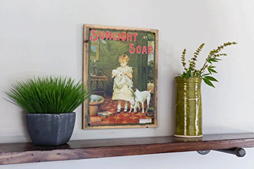 This is a unique, one-of-a-kind item (no two frames exactly alike). This is a rustic item made by hand from old barn and fence wood. Hand-made in America, these sturdy metal signs will perfectly accent any kitchen, home, or office. Each sign is created by baking enamelized ink into a tough, polyester coating on a thick steel blank. The result is amazing durability,rich color, and fine detail. Add a stunning and colorful touch to your home with these versatile and affordable wall accents. These are not like those thin, cheap tins other companies make. When you hold this sign in your hand you will definitely feel and see the difference. The frame: ----Outside dimensions of frame are 13" x 17" --Hand-made from rustic, recycled barn and fence wood --Every joint secured with wood glue --Edges and corners sanded smooth --Back is glued on then secured with twelve 5/8" brads. This is a very sturdy item. --Metal sign secured with 4 rusted screws --Easy-hang bracket on back for instant hanging (all you provide is a wall with a nail in it) The metal sign: --The metal sign itself measures 12" x 16" --Glossy, full-color, enamalized imaged baked onto recycled, thick, 24-gauge steel --Eco-friendly process -- handmade, right here in the USA --Ships in Ploy-bag for complete protectionFeature