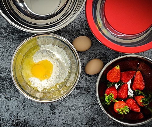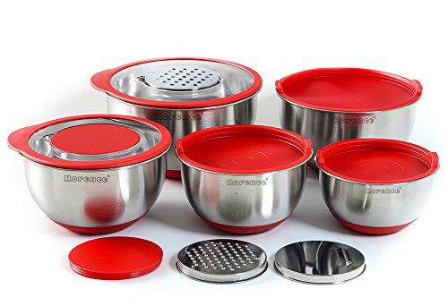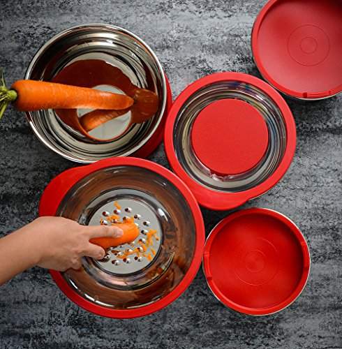Rorence Stainless Steel Mixing Bowl Set of 5 with 3 Graters & Transparent Lids - Red