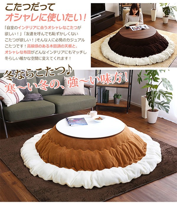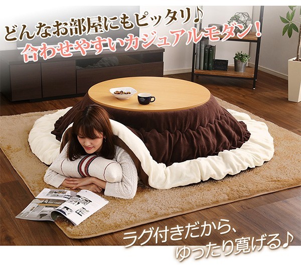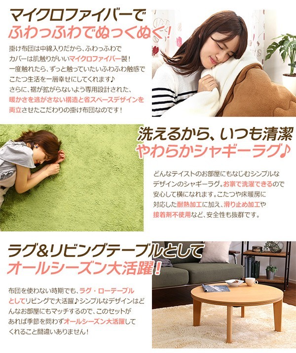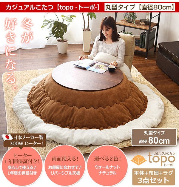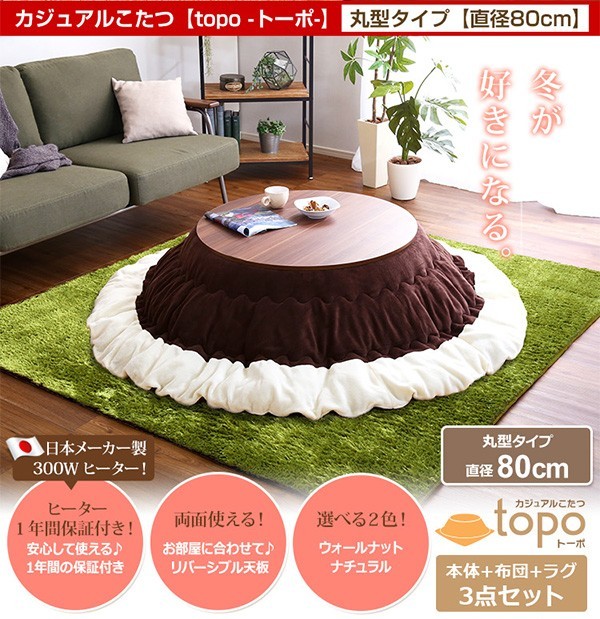 【商品について】カジュアルこたつ【-Topo-トーポ(丸型・80cm幅)】(こたつテーブル+掛布団+シャギーラグの3点セット)■サイズ:本体外寸:(約)幅80x奥行80x高さ35cm(約)16.5kg布団:(約)幅190x奥行190cm(約)1.7kgラグ:(約)幅190x奥行190cm(約)2.8kg■素材:(本体)天板:パーチクルボード、PVCシート、脚:MDF、PVCシート※付属品:300Wヒーター(メトロ電気工業株式会社製)・無段階温度調節機能、温度ヒューズ付(布団)表地、裏地、詰め物:ポリエステル100%(ラグ)表地:ポリエステル100%中材:ウレタンフォーム、表材:不織布■その他:・梱包サイズ:本体:(約)83x83x11.5cm(約)17.5kg布団:(約)56x45x22cm(約)2.7kgラグ:(約)50x48x22.5cm(約)3.6kg
