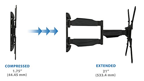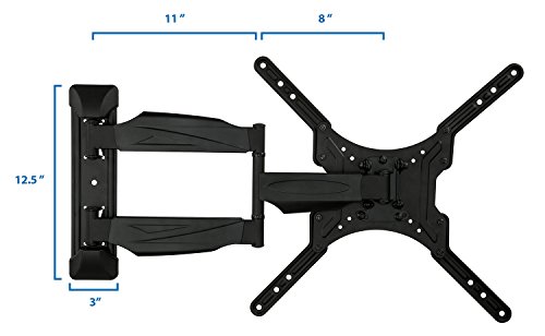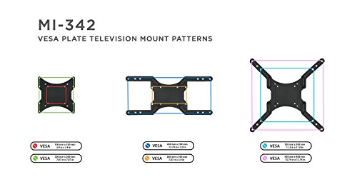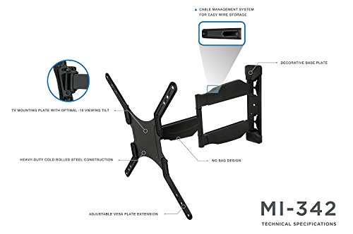 -. Binding : Electronics -. Brand : Mount-It! -. EAN : 0684758418906 -. Feature : HEAVY DUTY ARTICULATING TV WALL MOUNT. This single arm articulating TV mount holds up to 66lbs and can safely support 23 inch to 55inch LCD, LED, OLED, or Curved television. / UNIVERSAL COMPATIBILITY. Also works as a Monitor Mount with VESA 75x75mm or 100x100mm, or for TVs with VESA 200x200mm up to 400x400mm. / VERSATILITY. This mount can also be used as a corner TV mount! The hinged, articulating arm can extend up to 20.9" and compresses down to 1.75". / ADJUSTABLE TILT AND SWIVEL. Get up to 12 degrees of downward tilt and 180 degrees of left to right swivel from the wall bracket base for the optimal viewing angle. / EASY INSTALLATION. Includes mounting hardware kit, quick guide instructions, 400 VESA adapter extensions, and a micro adjustment feature for leveling the head bracket. -. Label : Mount-It! -. Manufacturer : Mount-It! -. Model : FBA_MI-342 -. MPN : FBA_MI-342 -. PackageQuantity : 1 -. PartNumber : FBA_MI-342 -. ProductGroup : CE -. ProductTypeName : CONSUMER_ELECTRONICS -. Publisher : Mount-It! -. Studio : Mount-It! -. Title : Mount-It! LCD LED Full Motion TV Wall Mount Bracket, Articulating Tilt and Swivel Wall Mount for 23-55" Flat Screen with VESA 75 to 400, 66lb Capacity WITH 20.9" EXTENSION (MI-342) -. UPC : 684758418906