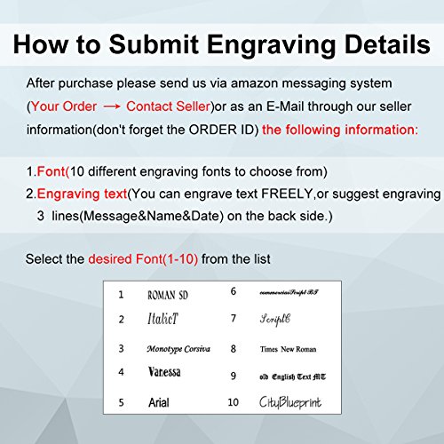 -. Feature : IMPORTANT!! How to Submit Engraving Details. / After you make the purchase please contact us via Amazon (Contact Seller) to submit your engraving information within 24 hours of purchase. / Free State of The Art Laser Engraving.Free Engraving includes 3 lines of text, you can engrave text FREELY! / Please kindly check the Left Guide Photo to choose the Font (Number1 to Number 10). / Great gifts for Christmas, Anniversary, Father's Day, Graduation, Bachelor Party, Wedding, Corporate Events etc.