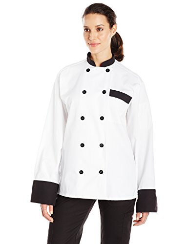 - Double-breasted chef coat in 7.5 ounce easy-care twill made partially from recycled polyester