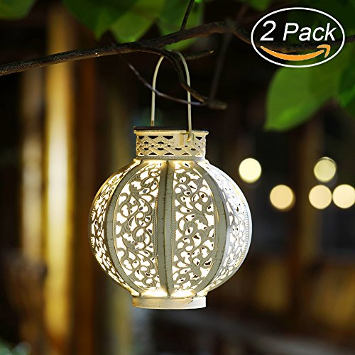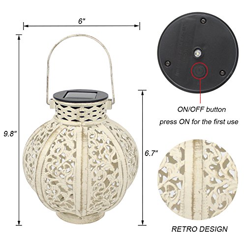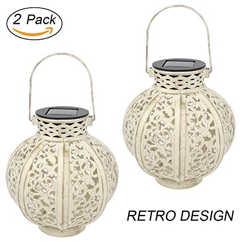 - Made of iron (white finish) and plastic, it is a decorative light so the light is subtle and soft, the ambient glow fills the area with calmness and beauty, rustic looking style hanging solar lights can be as a fine landscape accessory.2 Pack, the warm white LED is 4 lumens (3x) for added brightness. Measures: 6×6×6.7 inches. The surface of the lantern is deliberately designed as an ancient effect, NOT QUALITY DEFECT. IF YOU MIND, PLEASE DO NOT BUY.
