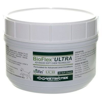 BioFlex Ultra is designed to work with your dog's immune system to help prevent joint degeneration, support advanced joint conditions, and manage mobility issues caused by arthritis or injury. It contains AyuFlex to help relieve pain, swelling, stiffness, support collagen production, and reduce collagen destruction. Formulated with hyaluronic acid to promote joint lubrication and flexibility, with additional glucosamine, MSM, boswellia and creatine to support mobility and cartilage tissue repair. BioFlex Ultra also serves as a natural source of essential Omega 3 fatty acids from grape seed extract.Feature