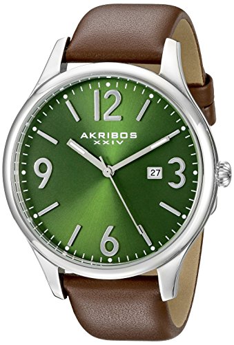 -. Binding : Watch -. Brand : Akribos XXIV -. Color : Green/Brown -. Department : mens -. EAN : 0848572072090 -. Feature : Radiant green sunburst dial with three hand movement and date display window at 3 o'clock position / Individually hand applied silver tone Arabic numeral and stick index with silver tone stick style hour and minute hands / Polished stainless steel case with brown genuine leather strap / Quartz movement with analog display / Water-resistant to 30 M (100 feet) -. Label : TWI Watches, LLC -. Manufacturer : TWI Watches, LLC -. Model : AK869GN -. MPN : AK869GN -. PackageQuantity : 1 -. PartNumber : AK869GN -. ProductGroup : Watch -. ProductTypeName : WATCH -. Publisher : TWI Watches, LLC -. Studio : TWI Watches, LLC -. Title : Akribos XXIV Men's AK869GN Round Green Dial Three Hand Quartz Stailess Steel Strap Watch -. UPC : 848572072090