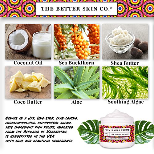 Genius in a Jar. One-stop, skin-saving, problem-solving, all-purpose cream transforms skin. This antioxidant-rich recipe, imported from Central Asia, is handcrafted in the U.S.A. with love and natural ingredients such as coconut oil, sea buckthorn, shea butter, cocoa butter, aloe and soothing algae to help moisturize, soften, balance and brighten skin. Helps calm skin while protecting skin's moisture barrier and fighting signs of age. Peptides and hyaluronic acid help skin appear smoother, more youthful and radiant.Feature
