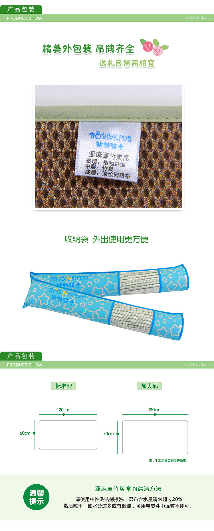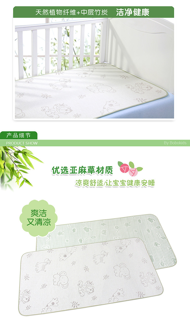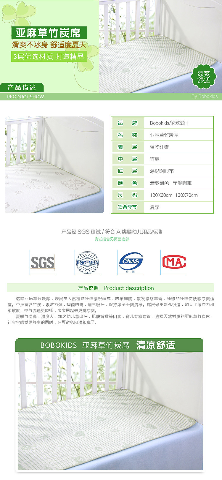 ???????????????bobkids/鲍勃骑士亚麻草竹炭席,产品表层由天然植物纤维编织而成,触感细腻,散发淡淡草香,亚麻纤维使肤感舒爽适宜。中层添加竹炭,抑菌防螨,透气吸汗,底层采用网孔织造,加大缓冲力和柔软度,空气流通更顺畅,宝宝用起来更觉凉爽舒适。夏季气温高,出汗多,实用亚麻草竹炭席,增加凉爽读,还可避免闷湿,降低痱子的产生。