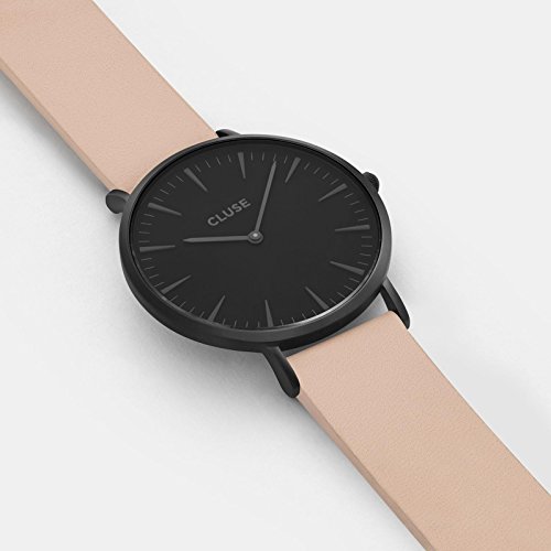 This La Boheme model features an ultrathin case with a 38 mm diameter, crafted with precision for a sophisticated and elegant result. A matte black case and dial are combined with a nude leather strap, detailed with a black clasp. The strap can be easily interchanged, allowing you to personalise your watch.