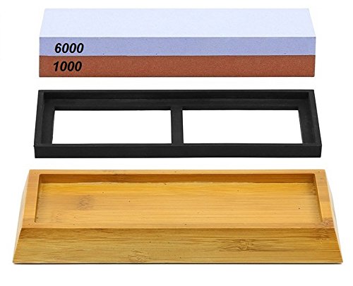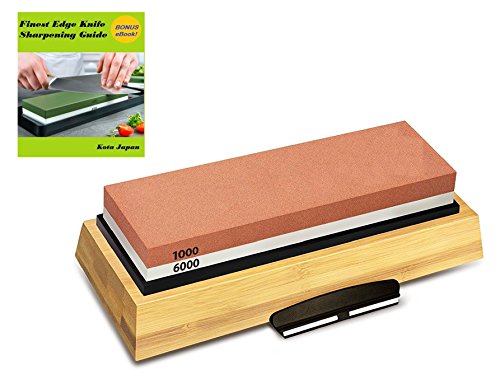 Kota Japan 1000-grit Coarse Side and 6000-grit Polishing Side Knife Sharpening Whetstone with Bamboo Base and Blade Guide
