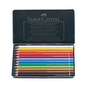 Faber Castell Polychromos Pencils are made with superior pigments of unsurpassed light-fastness and brilliance. Thick leads are smudgeproof and water-resistant. Intense colors go on smooth. Metal tin set of 12 assorted colors.