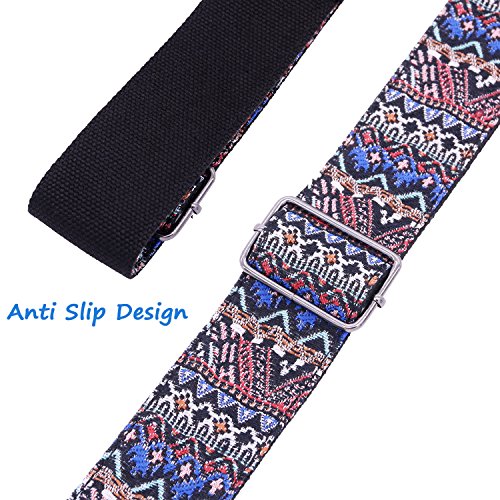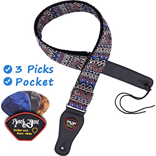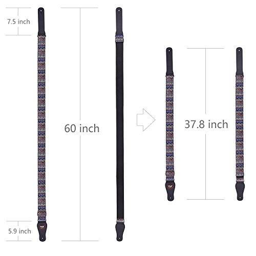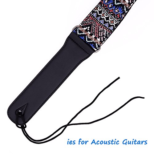 -. Feature : Unique & Stylish- Woven hootenanny style guitar strap with Vibrant color and Cool vintage pattern exclusively offered by Vinient Store. With durable, soft and comfortable cotton backing, leather ends,and Tri-glide adjustment for high durability. / Pick Pocket& Ties - Cool Looking guitar pick pocket on one strap end for your convenience. With ties for acoustic guitars. / Fit Most -Perfect Size with Width: 2", comfortable to wear; Fully adjustable length from 37.8" to 60"(96cm-153cm),to fit most sizes, for both adult and children. / Wide Compatibility - Works perfectly on acoustic guitar(with ties) and bass guitars. / Package includes 1X guitar strap and 3X Guitar Picks(Random colors).