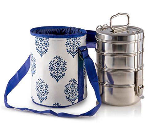 4 Tier Large Tiffin With Thermally Insulated Blue Patterned Tiffin Bag Carrier by Indian-Tiffin