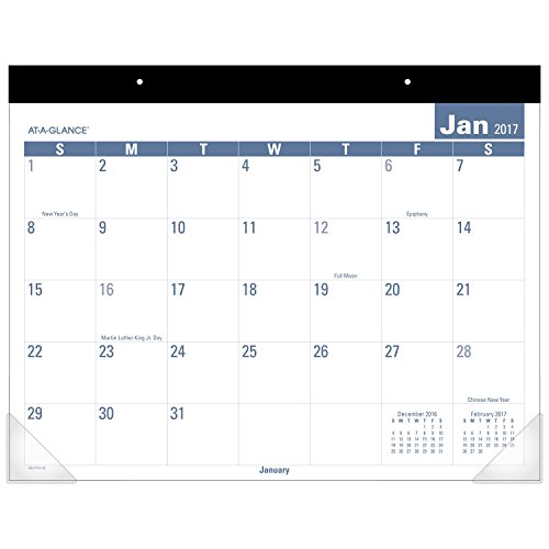 -. Binding : Office Product -. Brand : At-A-Glance -. EAN : 0038576193574 -. Feature : More writing space for each day with large, easy-to-read numbers / Covers 12 months of planning power (January - December). One month per page with unruled blocks. / Features durable backboard for sturdy writing surface. Bonus page: future year reference. / Includes black wide paper top binding. Clear corners for extra protection / Block size 2.31 in. x 2.5 in. Over all size 22 in. x 17 in. -. Label : ACCO Brands -. Manufacturer : ACCO Brands -. Model : SKLP2432 -. MPN : SKLP2432 -. NumberOfItems : 1 -. PackageQuantity : 1 -. PartNumber : SKLP2432 -. ProductGroup : Office Product -. ProductTypeName : OFFICE_PRODUCTS -. Publisher : ACCO Brands -. Studio : ACCO Brands -. Title : AT-A-GLANCE Desk Pad Calendar 2017, Easy to Read, 21-3/4 x 17" (SKLP24-32) -. UPC : 038576193574