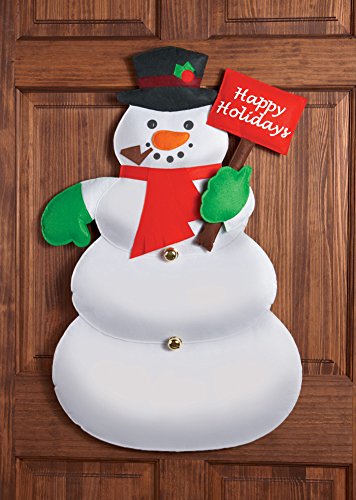 - Festively dressed felt snowman carries a "Happy Holidays" sign and wears a red scarf, green mittens and a holly decorated top hat.