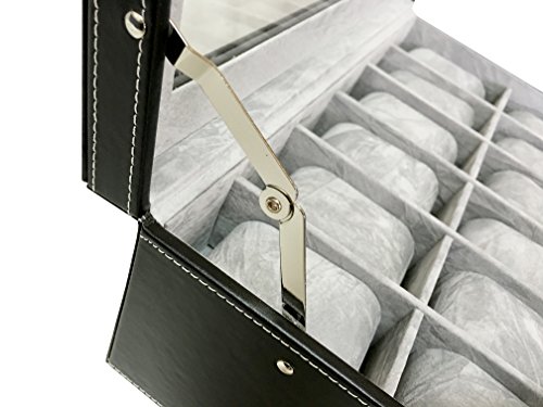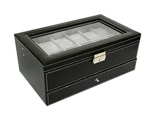Black PU Leather, Glass Top Watch Display Storage Box With Jewelry Box Case Organizer, Two levels, first level includes 12 removable velvet pillows, second level is a jewelry tray.