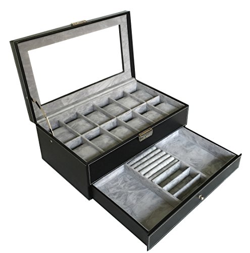 Sodynee Watch Box Large 12 Mens Black Pu Leather Display Glass Top with Jewelry Box Case Organizer Tray
