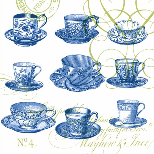 Paperproducts Design Toile Vintage Teacups Paper Beverage/Cocktail Napkin, 5-Inch by 5-Inch, Blue/White