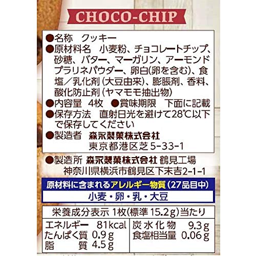 原材料:小麦粉、チョコレートチップ、砂糖、バター、マーガリン、アーモンドプラリネパウダー、卵白(卵を含む)、食塩/乳化剤(大豆由来)、膨脹剤、香料、酸化防止剤(ヤマモモ抽出物)