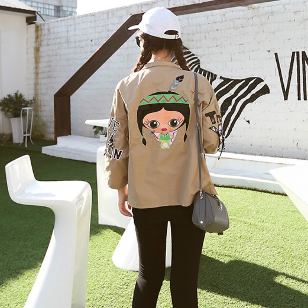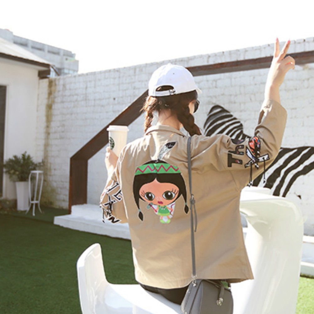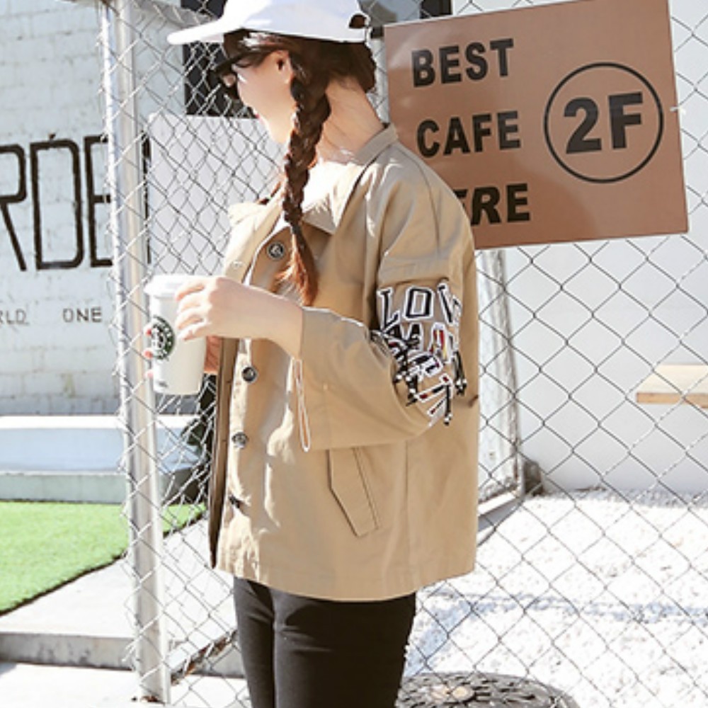 たっぷりカジュアル☆個性的 ロゴワッペン+バックプリント ジャンパー ショートコート ジャケット カーキ
