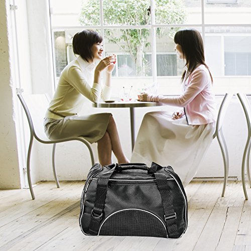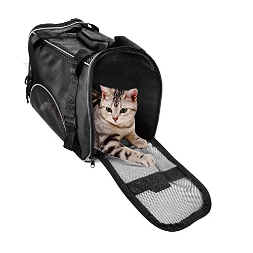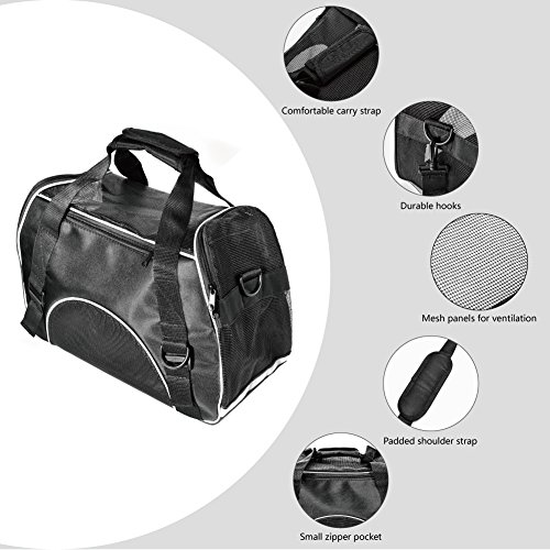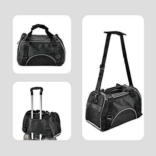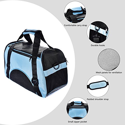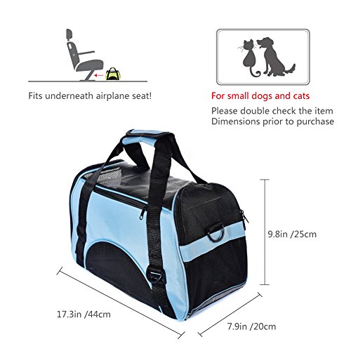 -. Feature : AIRLINE APPROVED SIZE: 17.3" X 7.9" X 9.8" for airplane travel. Fit under the seat as well as a handbag. Easy to carry and to get the pet in and out. Airline approved pet carrier for kittens, puppies and teacup breeds smaller than 8 POUNDS. / ZIPPERED CLOSURES: The mesh panels allow dog cat to observe her surroundings within the safety of the carrier.It has an opening on one side that can be unzipped all the way for easy pet insertion. On the other side of the carrier it has another zipper that can be unzipped halfway to allow your pet to poke their head out so they won't feel so confined and give it treats if you needed to. / TRAVELING with YOUR DOG & CAT: When you are on road trips,restaurants (not always necessarily dog friendly),flights and traveling, this pet carrier will necessary to carry and having a hands free option makes life so much easier. Put the bag over shoulder and shop where ever animals are not allowed.Safety belt buckle allows carrier to be restrained with vehicle seat belt. / WATERPROOF MATERIAL and REMOVABLE BOTTOM CUSHION: This pet carrier is made of durable, lightweight, waterproof nylon and mesh materials. It comes with a removable pad for comfort and easy cleaning. / WARRANTY: Pet Carrier comes with a 12 months warranty.