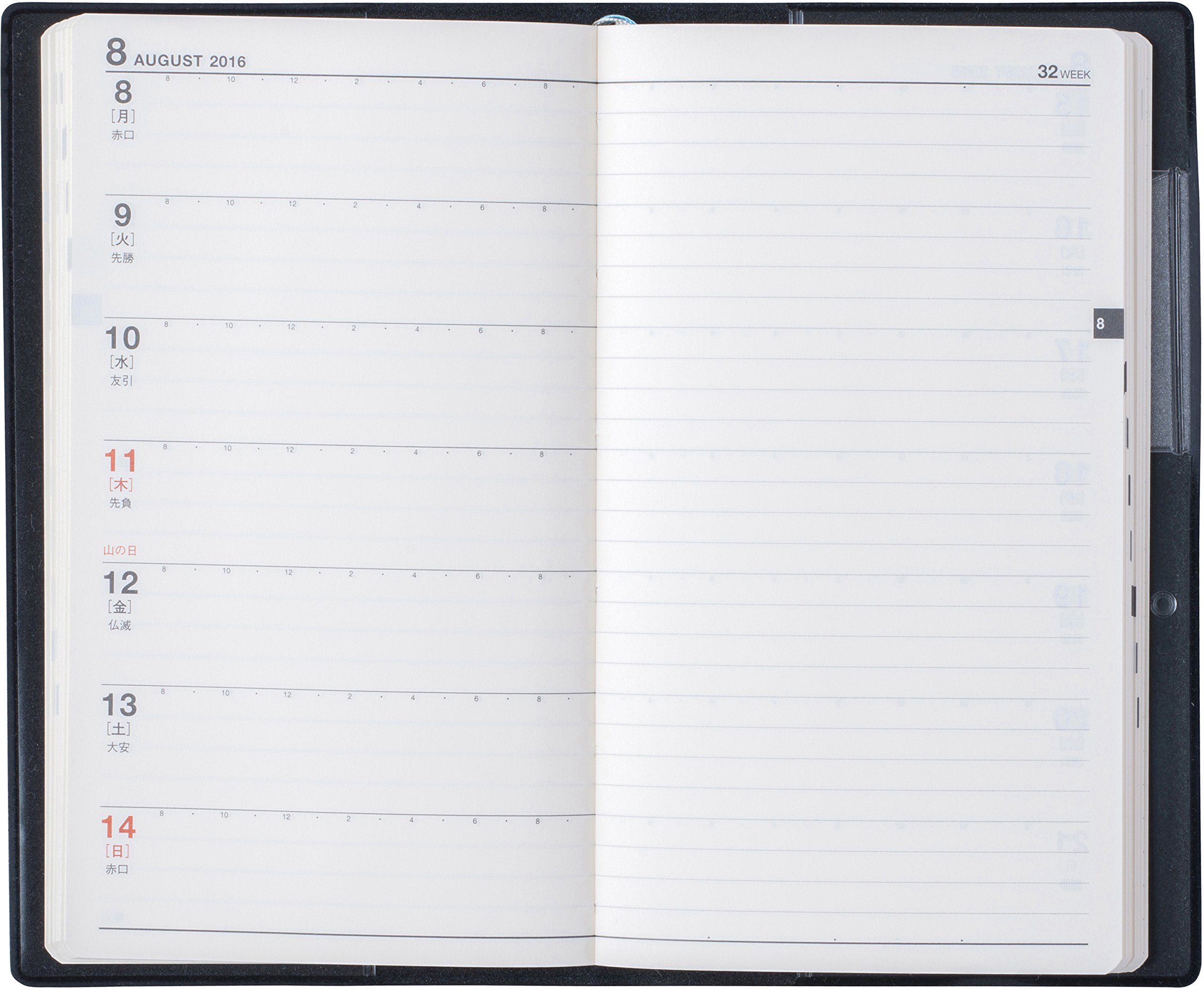 The left page is a schedule section for one week, the right page is free sideways keimemo.