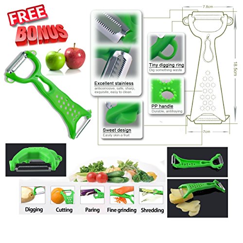 - ★ FREE BONUS PEELER KITCHEN GADGET Easily shave away outer layers of fruits and vegetables. Solid and reliable design makes this multi-function kitchen aid easy to hold and handle. Non slip design works well with peeling hard veggies or soft fruits like Kiwis. Excellent sharp stainless steel cutting blades to peel and julienne Carrots Potatoes Apples Squash Cucumbers Zucchinis Tomatoes and the list goes on. One of the most user friendly & efficient kitchen gadgets on the market