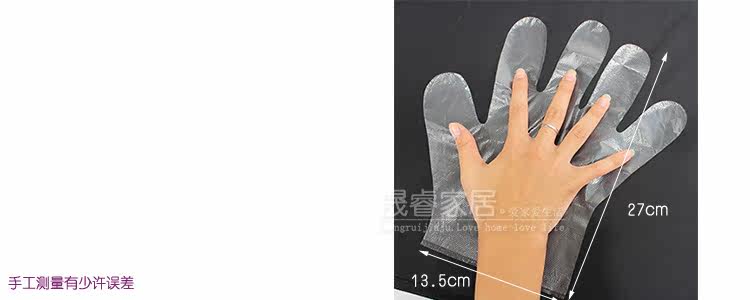Using PE material? non-toxic? odorless? environmentally friendly? waterproof? leakproof? pasteurized? toughness? feel better? more convenient? more practical? more clean? suitable for hotels? restaurants? and family travel? outdoor sports or outdoor events. Food processing? health care? pharmaceuticals with taking kitchen cooking? housework? hair salon? home cleaning? beauty salons? camping? barbecue and restaurants need to hand contact with food are available? allowing you to keep the hand skin? avoid the effect of excessive exposure to alkaline cleaners for the home life of the yield.