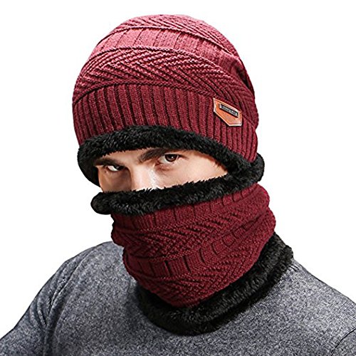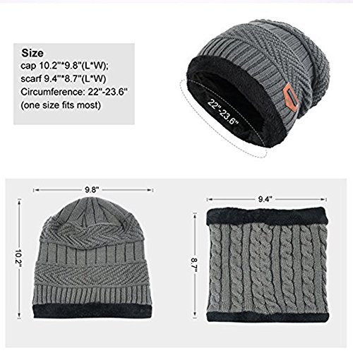 Product DescriptionMaterial: outer-acrylic knit, inner-fleece lining. Size: cap-10.2"*9.8", scarf-8.7"*9.4", circumference-22"-23.6". Color: Wine red, Dark grey, Dark blue, Khaki, Coffee, Black. Package include: 1*skull cap 1*scarf0