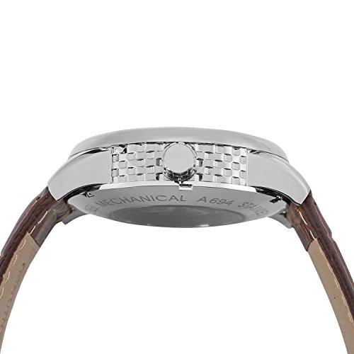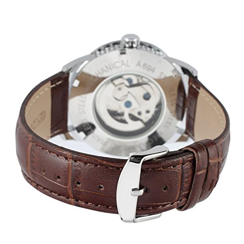 GuTe Mechanical GuTe출품 손목시계 맨즈 스켈리턴 가죽 밴드 앤틱풍 로마숫자 기계식 자동 감기 실버 브라운