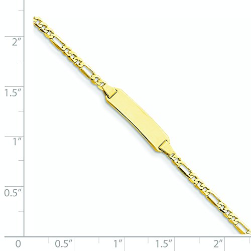 Chain Type: FigaroBracelet Type: ID BraceletsMaterial: Primary: GoldMaterial: Primary - Color: YellowMaterial: Primary - Purity: 14KLength of Item: 8 inWidth of Item: 5 mmFinish: PolishedChain Length: 8 inChain Width: 5 mmClasp /Connector: LobsterFeature(1): SolidEngravable: Yes