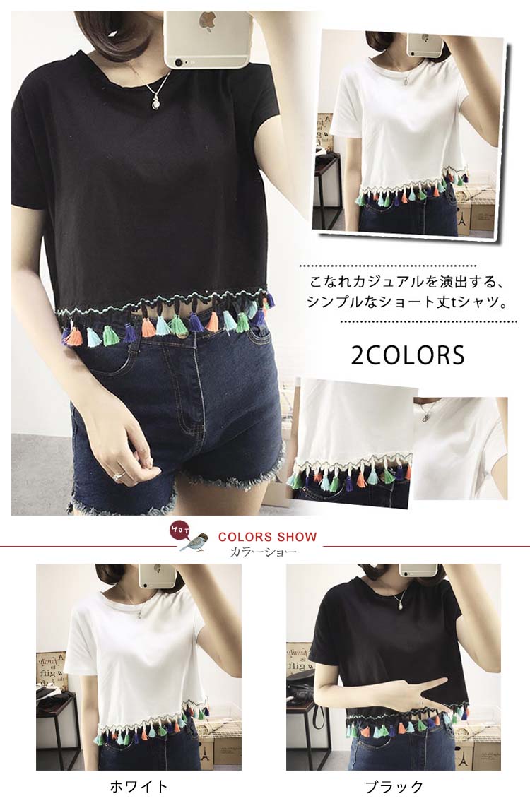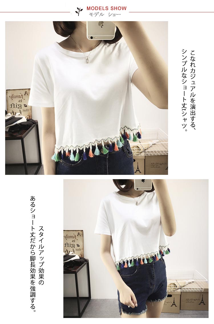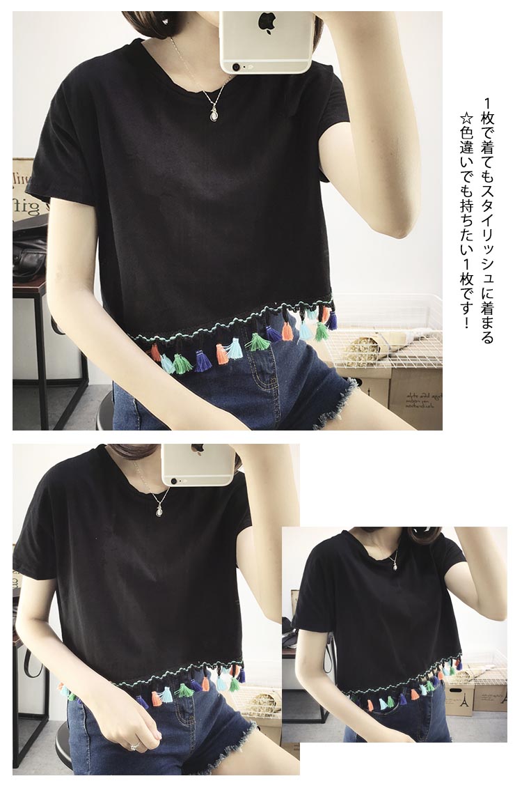 | こなれカジュアルを演出する、シンプルなショート丈tシャツ。スタイルアップ効果のあるショート丈だから脚長効果を強調する。裾にはカラフルフリンジが歩くたびに揺れて可愛いシルエットに魅せます。トレンドのワイドパンツやスカーチョとも相性が良く、デイリーに大活躍のアイテムです☆1枚で着てもスタイリッシュに着まる☆色違いでも持ちたい1枚です! | |