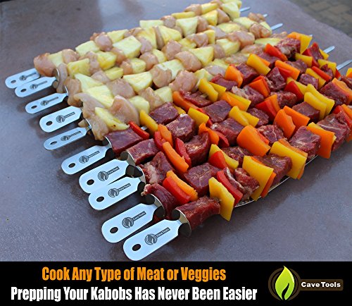 Maximum Length Barbecue Skewers STORAGE CASE - FOOD REMOVAL DISC - DISHWASHER SAFE 5 Reasons Why Cave Tools Has the Best BBQ Skewers on the Market: 1. Maximum Cooking Surface Area - A full 15.5 inches of space per skewer dedicated to food so you can cook kabobs for the entire party 2. Simple Food Removal Ring - Built in food slider easily pushes all food off the skewer 3. Canvas Storage Case - Conveniently hang your skewers by the grill or inside the pantry when not in use 4. Dishwasher Safe - Stainless Steel design makes clean up incredibly easy and quick 5. Extra Thick Stainless Steel - Your skewers won't bend when loaded with meat and veggies OUR UNBEATABLE LIFETIME GUARANTEE If at any point in the life of your barbecue skewers, if you feel like you received less value than what you paid for it, we will give you a full refund for your money. Even if you use your shish kabob skewers for an entire year, if you want your money back, we will give you a full refund for your purchase. THE GRILL MASTER'S ESSENTIAL BARBECUE RECIPE BOOK Download instructions included with purchase. Complete with 25 Professional BBQ Recipes, Step by Step instructions, Tutorial Videos, and access to over 135 Cooking Videos
