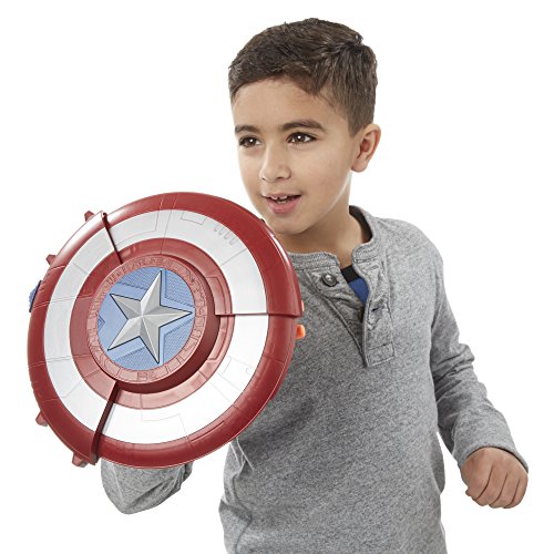 Captain America fights for battle victory with superhuman strength, agility, and an indestructible shield! He's America's first Super Soldier, fighting fearlessly on the side of justice. Kids can imagine what it's like to battle like Captain America with this Blaster Reveal Shield, which includes 2 launching projectiles! Just push down the star button to watch the shield open, revealing a hidden blaster designed to take enemies down! Heroes-in-training can also use the shield as protection, and when they reveal the blaster, they'll have the ultimate weapon! Copyright 2016 Marvel. Hasbro and all related terms are trademarks of Hasbro.Feature