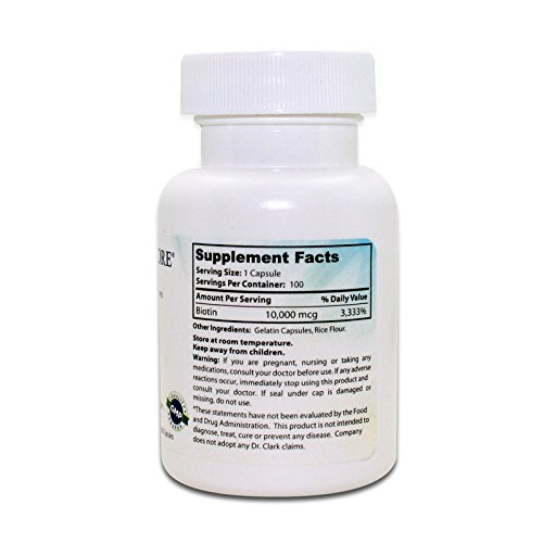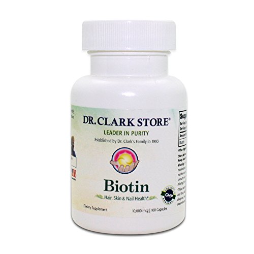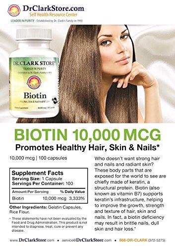 -. Binding : Health and Beauty -. Brand : Dr Clark Store -. EAN : 0652384104579 -. Feature : Nervous system support* / Promotes energy production* / Promotes healthy hair, skin & nails* / Supports fat, protein, and carbohydrate metabolism* -. IsAdultProduct : 0 -. Label : Dr. Clark Store -. Manufacturer : Dr. Clark Store -. MPN : 10457-100 -. PackageQuantity : 1 -. PartNumber : 10457-100 -. ProductGroup : Health and Beauty -. ProductTypeName : HEALTH_PERSONAL_CARE -. Publisher : Dr. Clark Store -. Studio : Dr. Clark Store -. Title : Biotin - High Potency - 100 Capsules Per Bottle - 10,000 mcg Per Capsule -. UPC : 652384104579