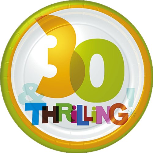 Studio : Party Express Publisher : Party Express Binding : Toy Product Description From The Big Day! Birthday Party Collection. The Big Day! 7" 30th Birthday Dessert Plates. Celebrate with this colorfully fun pattern. Coordinates well with the Celebration Balloons party supplies. These white party themed plates feature a colorful print which reads "30 Thrilling!" 8 paper plates included in a pack. Each measures 7" across. 0