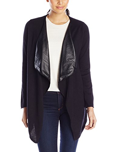 This cardigan offers a contemporary twist with its fun faux-leather trim