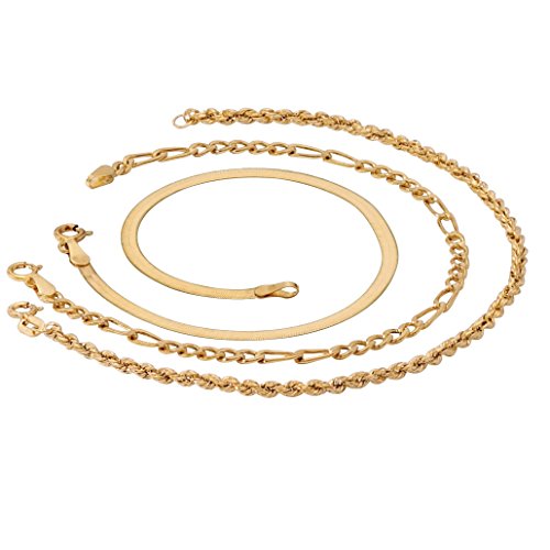 -. Title : 18k Gold over .925 Sterling Silver 3-Piece Figaro, Herringbone and Rope Ankle Bracelet Set 10"
