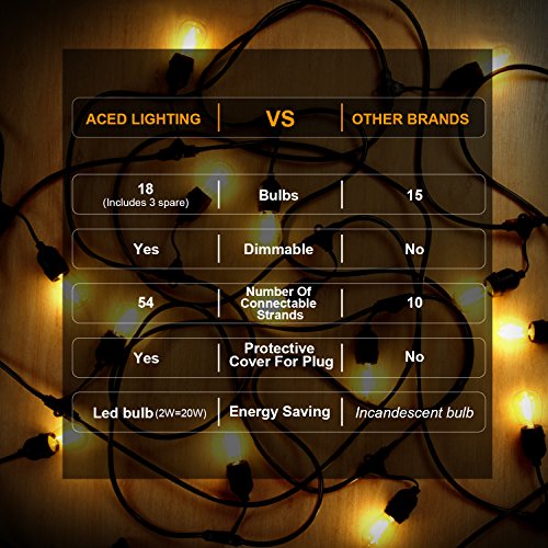 - 【CONNECTABLE】: The rated power of the light strand is 1625V, and you can connect up to 54 strands with 2W bulbs end to end. So you will not worry the hanging patio string lights cannot cover large areas. And you can feel free to customize your arrangements. Every two bulbs space 3 feet apart to avoid break and standing up wonderfully with a gale force wind.