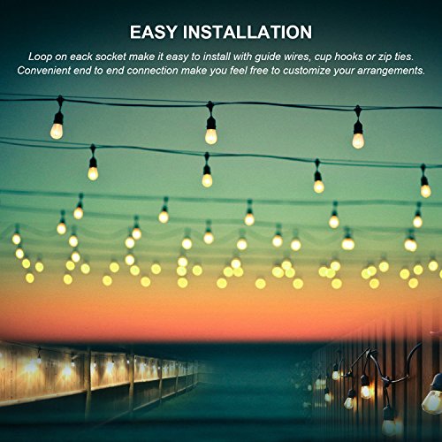 - 【EASY TO HANG】: Durable and convenient loop on each socket make installing them super easy. Use cup hooks, guide wires, or zip ties with the built-in loops to hang perfectly. Use the loops to hang LED outside string lights easily for backyard patio deck pergola proch gazebo balcony pool museum bistro tents market café décor.