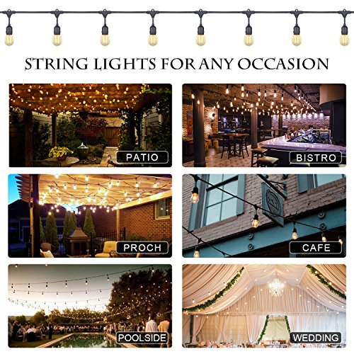 - 【COMMERCIAL GRADE & YEAR-ROUND USE】: Commercial grade outdoor string lights are made from heavy duty wire and have sockets with insulation layers that form a seal around the LED edison bulb string lights to keep water out. Encapsulated with PVC to resist UV sunlight exposure and withstand the weather duing long term year-round use.