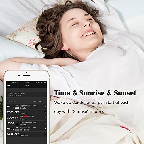 - TIMER & DIMMER: Easily set your flexible strip light to turn on or off in a specific time by use APP. Use the "Sunrise" mode to let the light strip gradually brighten as you wake up and the "Sunset" to have it gradually dimming when you sleep。 RGB light strip can be used as a indicator for your child whether it’s ok to wake up yet, help to establish a routine