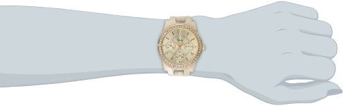 - Feature : Watch with gold-tone dial, rhinestones framing bezel, and three-link horn bracelet / Quartz movement with analog display / Protective mineral crystal dial window / Features fold-over clasp and non-working subdials / Not water resistant