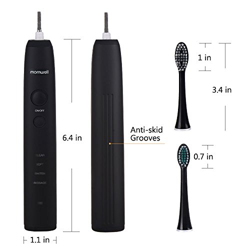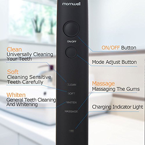 Product features: 1. 4 brushing modes offer varying oral care needs: ** Clean: Universally cleans your teeth ** Soft/Sensitive: Perfect for sensitive teeth and first-time users ** Whiten: General teeth cleaning and whitening ** Massage: Massages the gums These brushing modes has been proved efficiently which just like the sonicare toothbrush does. 2. 2 minutes auto brushing time and the 30 seconds timer reminds you to switch quadrant. 3. Mini inductive charging base saves counter space, and comes with 4 Anti-Slide rubber in the button. 4. The product can work for up to 2 weeks (two minutes each time, twice a day) after a single charge for 24 hours. 5. The two-color battery level indicator lets you know when need to recharge. 6. 2 kinds of brush heads are included to offer different care needs: ** Professional brush head: Conform to contour of teeth for effective deep cleaning ** Multi-function rubber brush head: Rubber head guard cushions your teeth and tooth enamel while also cleaning your tongue 7. IPX7 Waterproof design allows you to wash this product. 8. Environmental rechargeable Lithium-ion battery makes sure longer battery life. What you will get: Mornwell Rechargeable Toothbrush Handles X 1 Brush head with cap X 2 Rubberized brush head with cap X 2 Inductive Charging Base X 1 (US Plug) User manual X 1 Warranty: We provide 18-month warranty. Please contact us for a satisfactory solution if any issues during warranty. 0 |