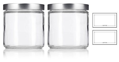 Large Clear Thick Glass Straight Sided Jar with Silver Metal Lid - 16 oz / 480 ml (2 pack) + Labels