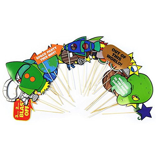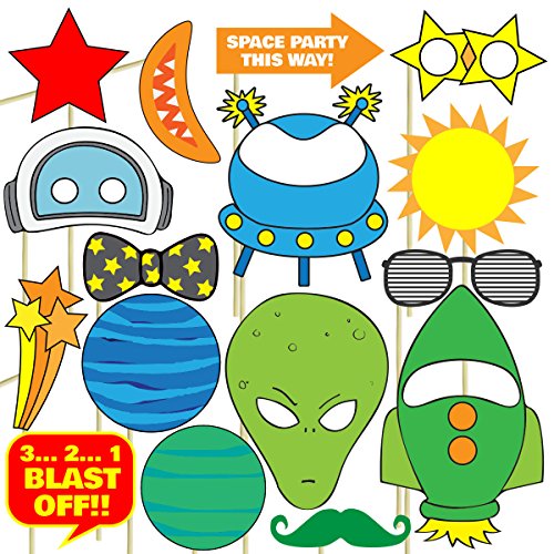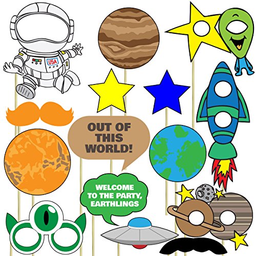 - Blast off! Our super exciting Space Photo Props (32 Pieces) are printed on high-quality, thick cardboard with rounded, smooth sticks already put together for your convenience. Who wants to spend the night before your solar system styled party assembling photo props and hoping the glue sticks hold? NO ASSEMBLY REQUIRED for our photo booth supplies!