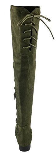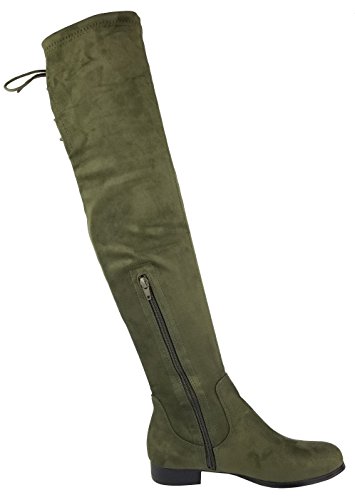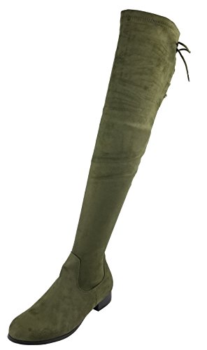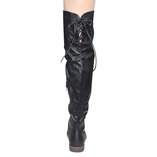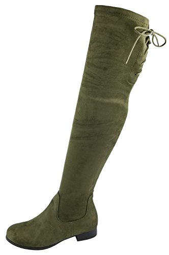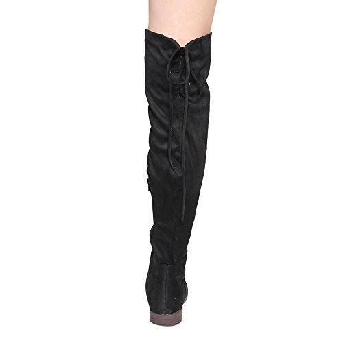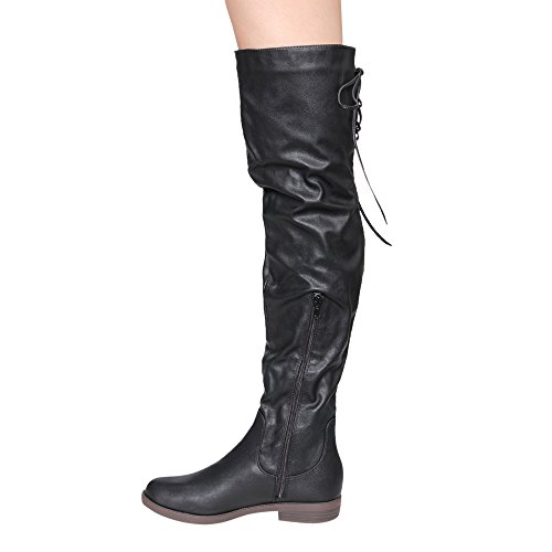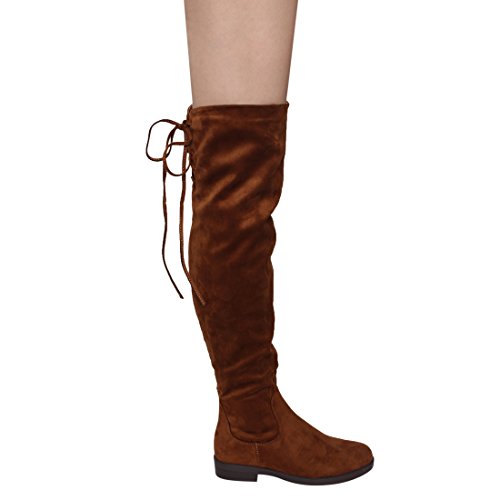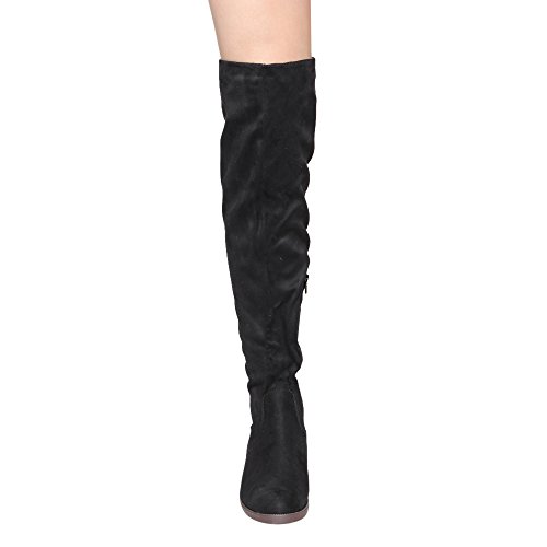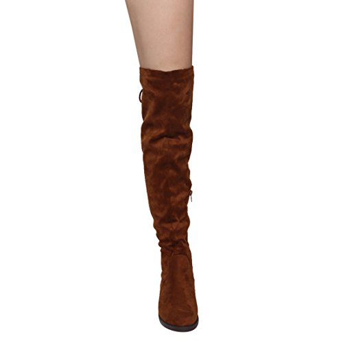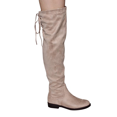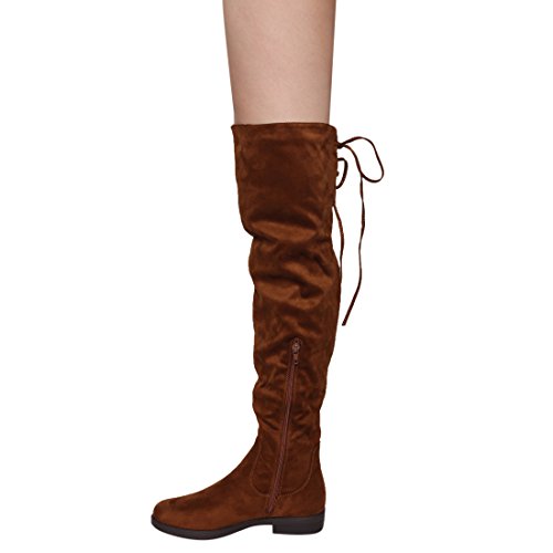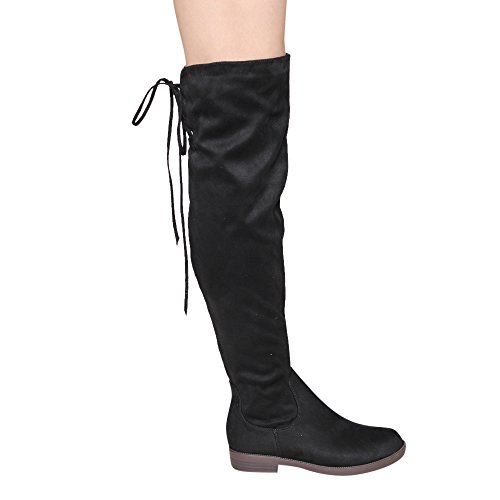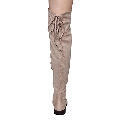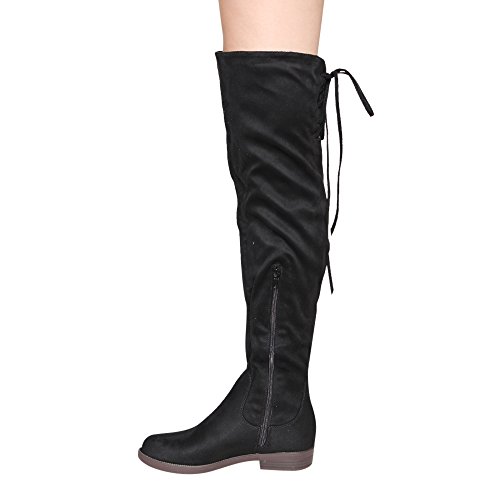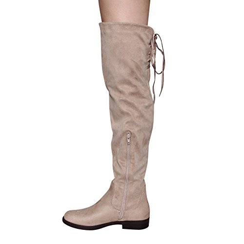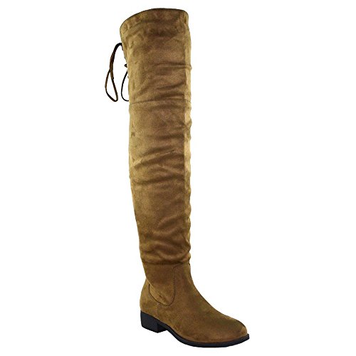 Product Description Walk in comfort and style in these thigh high boots are featuring a drawstring tie up look at the top of the shaft, and a side zip closure, low chunky heel. We have two material for your choose, faux suede: black, nude, tan taupe; Faux leather: black. 0