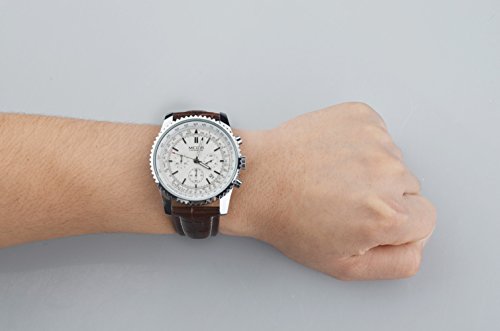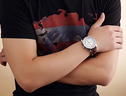 -. Feature : Sporty watch in featuring white dial with 3 workable sub-dials for chronograph minute, chronograph second and 24 Hr Indicator. / Leather brown watchband and alloy case with safety buckle, no any hurt of your clothes or hands. / Quartz movement with analog display with luminous hour/minute hands, easy to read at dark. / Water resistant up to 3 ATM (Suitable for everyday use. Splash/rain resistant. NOT suitable for diving, swimming, snorkeling, water-related work). / Luxury Army design watch, perfect gift for men.